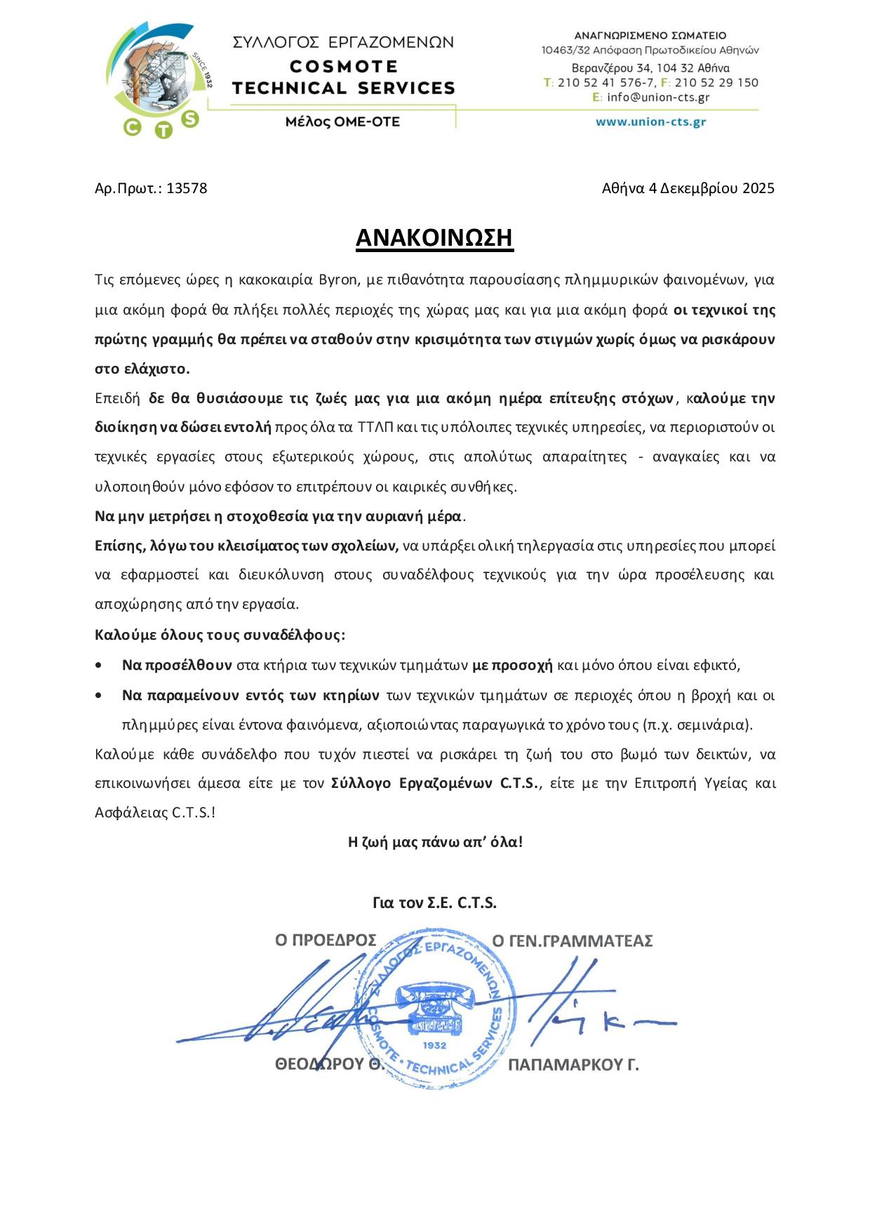 Ανακοίνωση Σ.Ε.C.T.S. 4-12-2025 ΚΑΚΟΚΑΙΡΙΑ