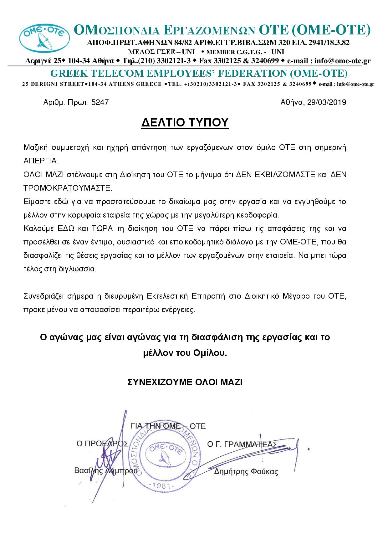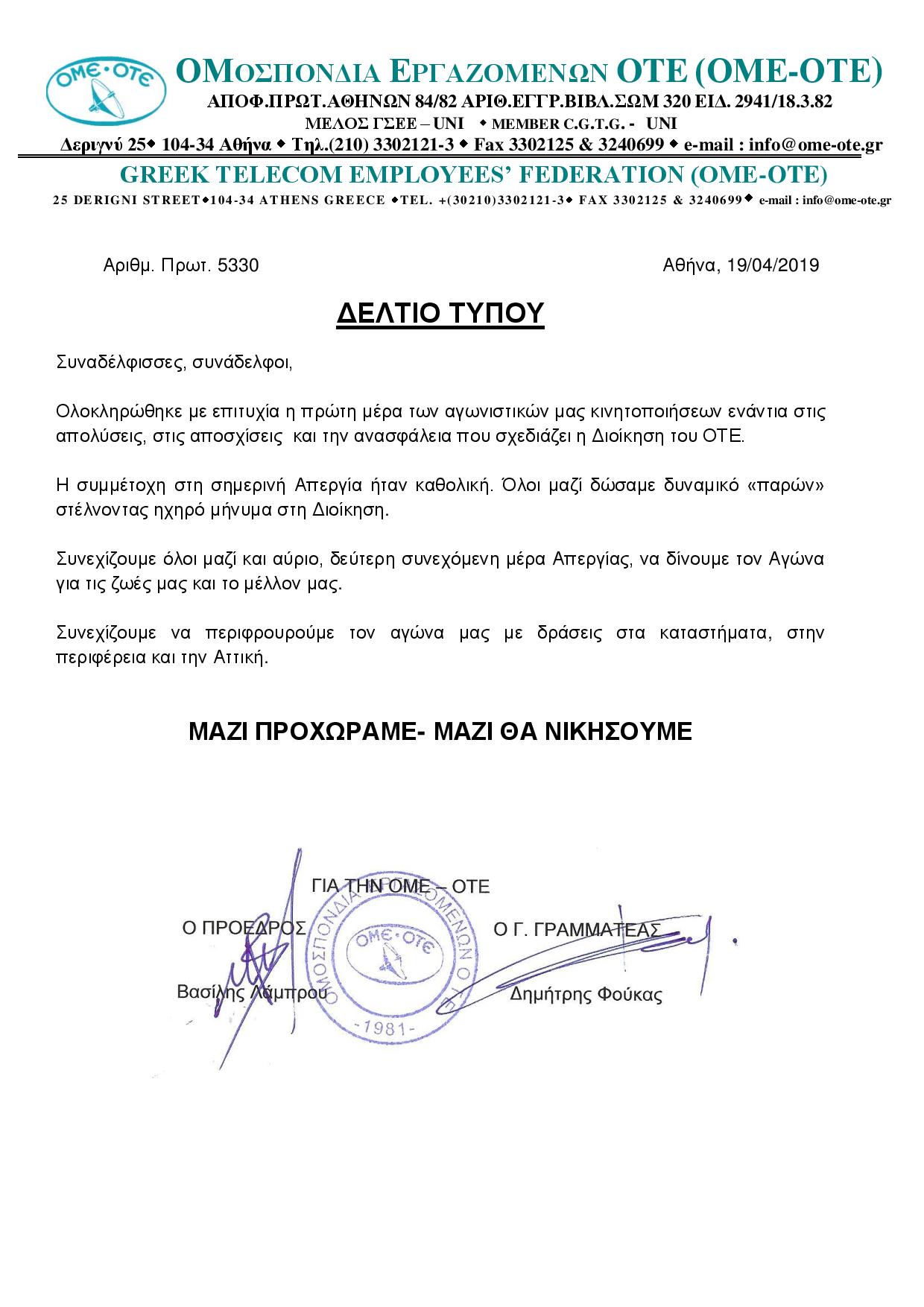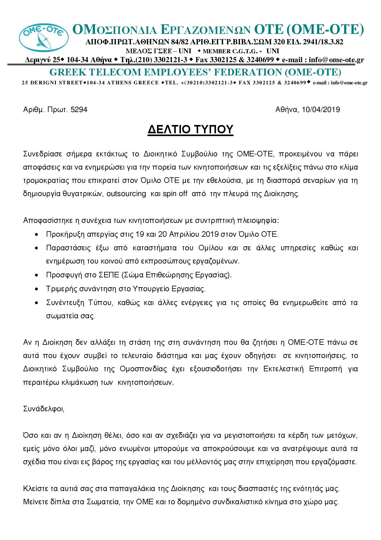 ΔΣ 10-4-19 ΑΠΟΦΑΣΗ ΓΙΑ ΑΠΕΡΓΙΑ ΣΤΟΝ ΟΤΕ