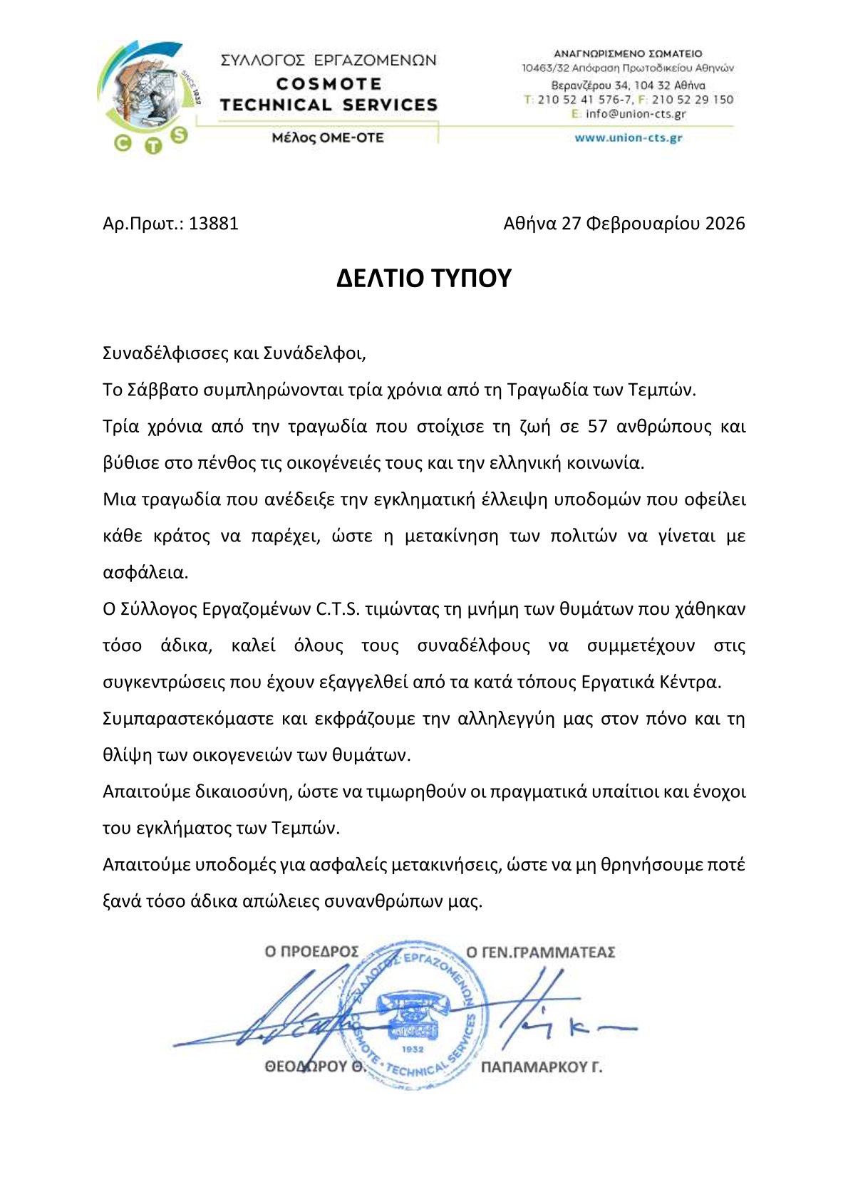 Δελτίο Τύπου Συλλόγου Εργαζομένων CTS 27-2-2026